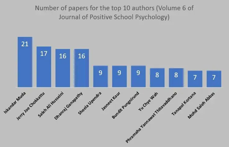 Tweet: Looking at Journal of Positive School Psychology. In Volume 6, 2022, here are the top 10 authors. We don’t want to be too judgmental, other than to observe that 21 articles in one journal issue seems a lot? @Scopus #Jnl_PSP https://buff.ly/3a4oKou